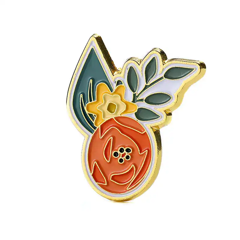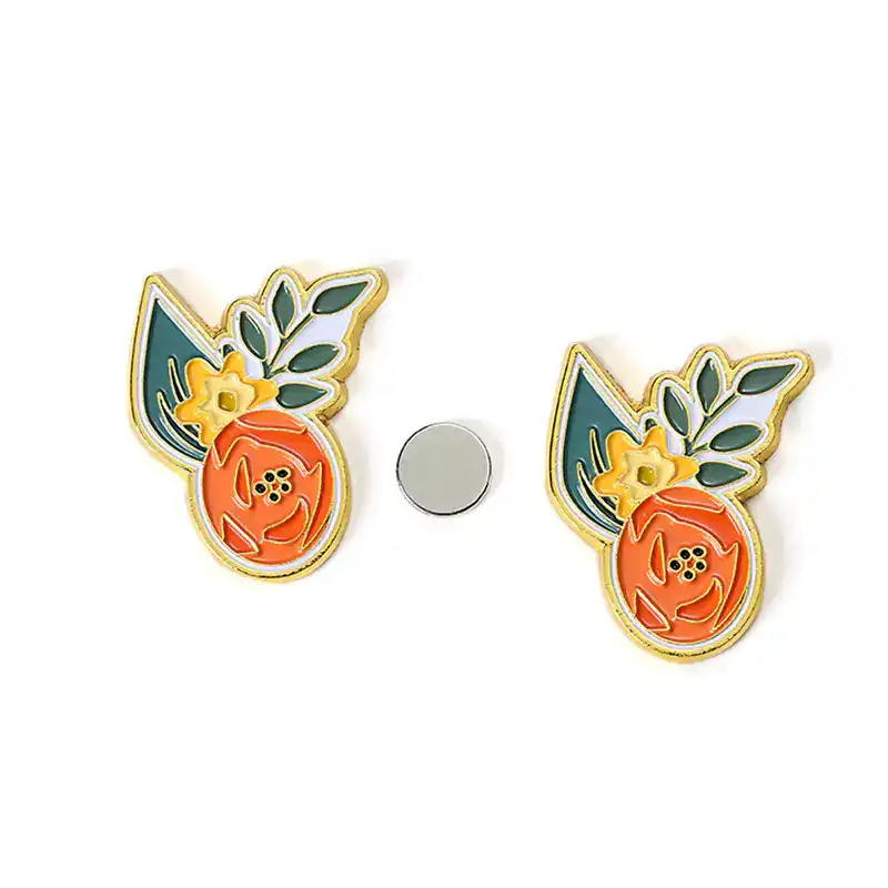 Distintivo magnetico dorato con frutta, motivo a foglie verdi sulla superficie, superficie smaltata dura con colori ricchi, supporto in sabbia + forte magnete sul retro per una presa salda. Supporto per logo personalizzato.