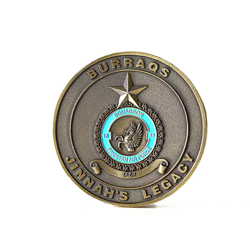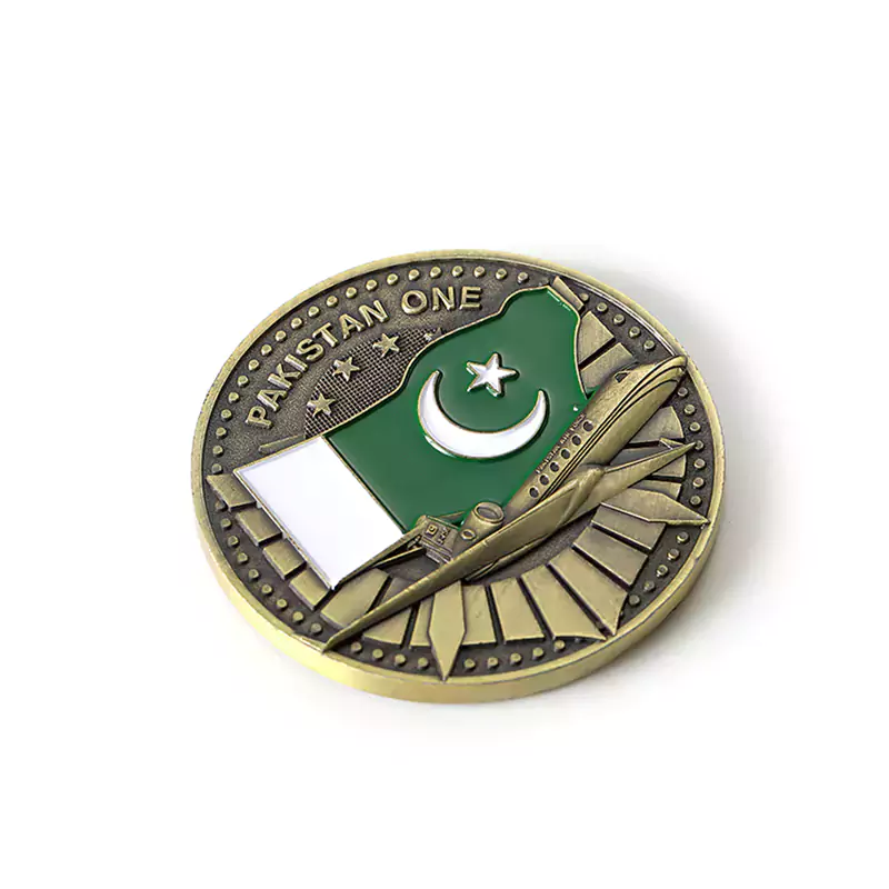 Moneta commemorativa dipinta in 3D con il tema dell'aeronautica militare pakistana. Ha un colore dorato-rame vintage con una texture ricca. Su un lato è incisa la scritta “JINNAH'S LEGACY” e al centro è presente l'emblema dell'aeronautica militare; sull'altro lato è decorata con una bandiera pakistana dipinta, accompagnata da un jet da combattimento in rilievo e dalla scritta “PAKISTAN ONE”, con dettagliati elementi tridimensionali dal forte significato commemorativo militare. Si tratta di una moneta commemorativa unica, dal valore sia collezionistico che commemorativo.