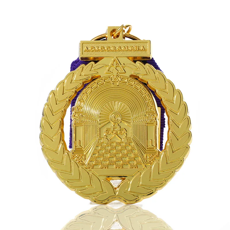This purple-black ribbon with golden hollowed-out commemorative badge is meticulously crafted from high-quality alloy. The main body features a golden hollowing-out technique, with a relief engraving of the Masonic Temple pattern on the front, accompanied by a laurel wreath. The details are rich and three-dimensional. The purple-black striped ribbon and the metal pin design ensure a stable fit and a distinct visual hierarchy. The overall style is solemn and elegant, possessing both collection and commemorative value. It is an ideal choice for honor recognition, event commemoration, and personalized collection.