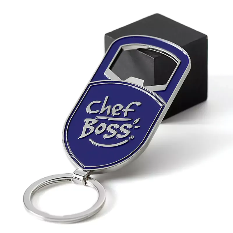 这款以厨师为主题的金属 开瓶器钥匙扣 以亮银色电镀底座为特色,配以优质蓝色漆面,呈现出高光泽的表面效果和鲜明的色彩对比。它拥有精致的盾牌形状,正面支持定制徽标品牌,具有坚固耐用的开瓶结构和便于携带的银色钥匙扣。它将实用功能与品牌展示价值完美融合,工艺精湛,质感上乘,是餐饮业、厨师商品和定制礼品的理想选择。.