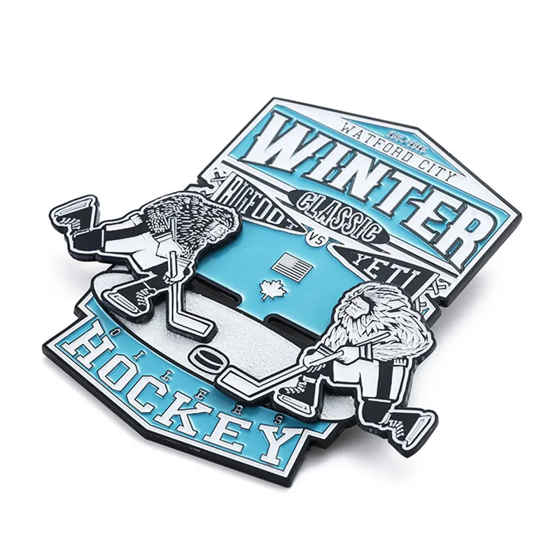 这 奖章 这是为沃特福德城2024-2025冬季经典冰球锦标赛推出的限量版纪念品。它生动地描绘了HIFDDI队和YETI队之间激动人心的对决。复古的蓝白配色方案融合了美国和加拿大国旗的元素,YETI球员的卡通形象充满活力,再现了冰球场上紧张激烈的氛围。它不仅是本次锦标赛的专属纪念品,更是一件兼具艺术美感和收藏价值的独特藏品,是冰球爱好者和徽章收藏家不容错过的珍品。.